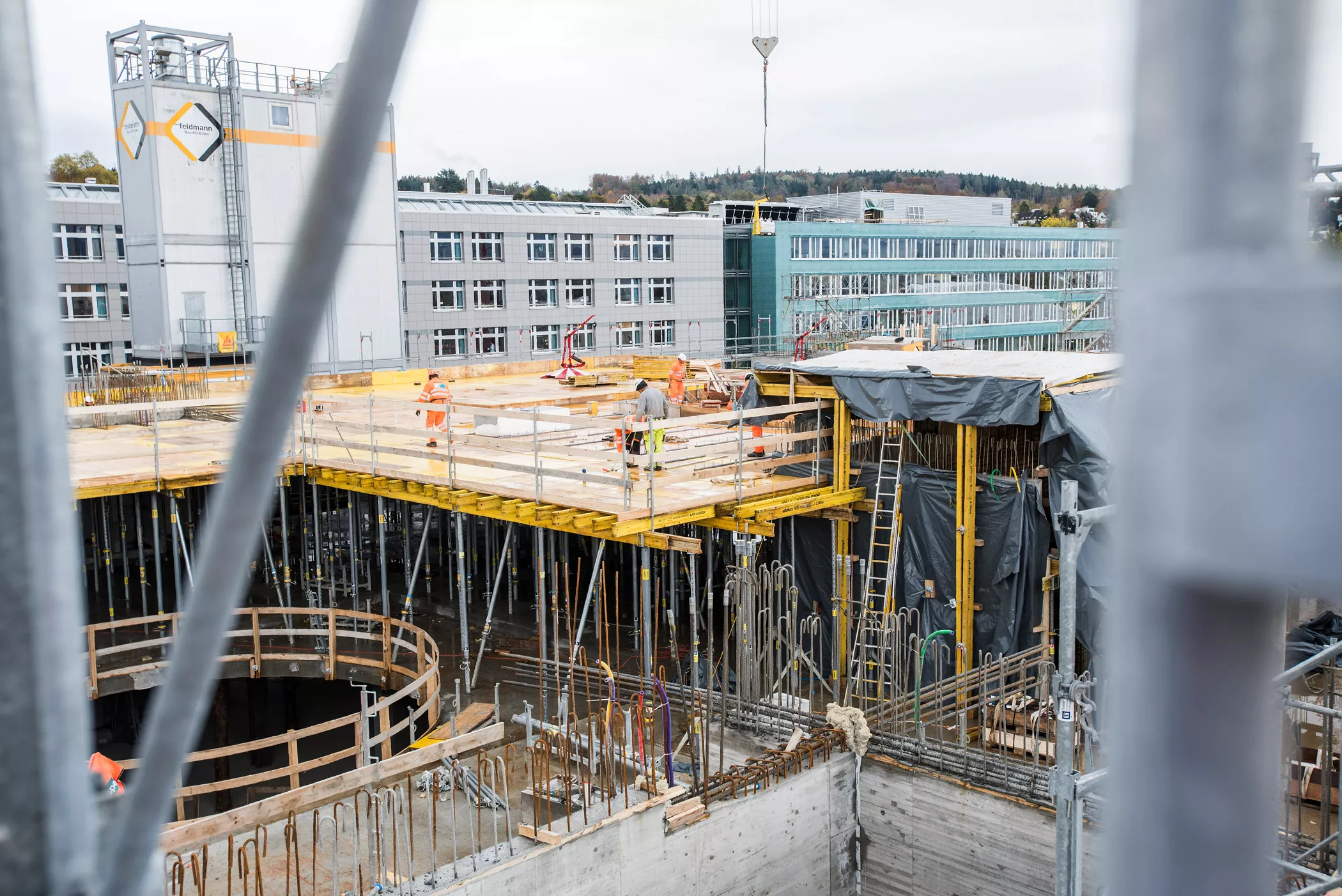 Die Tage sind kürzer, die Bäume kahler, die Temperaturen purzeln – unser Neubau ragt indes mit jedem Tag ein Stückchen weiter gegen den Himmel. So erwartet Thomas Hardegger, dass bereits im Frühsommer 2020 alle sieben oberirdischen Geschosse des LLF-Gebäudes stehen werden. Er ist der Gesamtprojektleiter für den Neubau. «Auch im Winter wird weiter gebaut, ausser wenn die Temperaturen unter -5 Grad Celsius fallen», erklärt er. «Dann werden die Betonarbeiten temporär unterbrochen, weil der Beton nicht schnell genug aushärtet.»